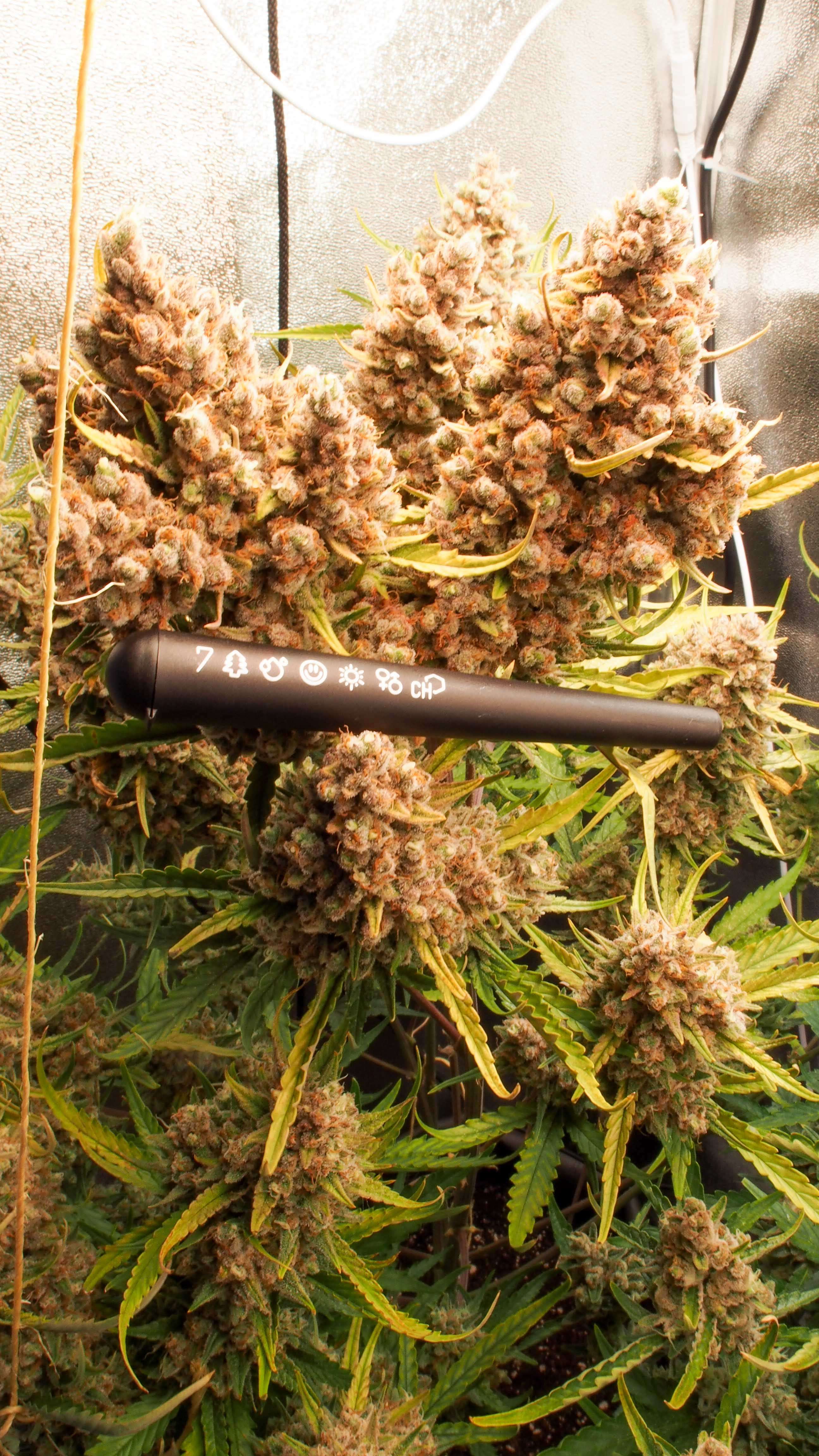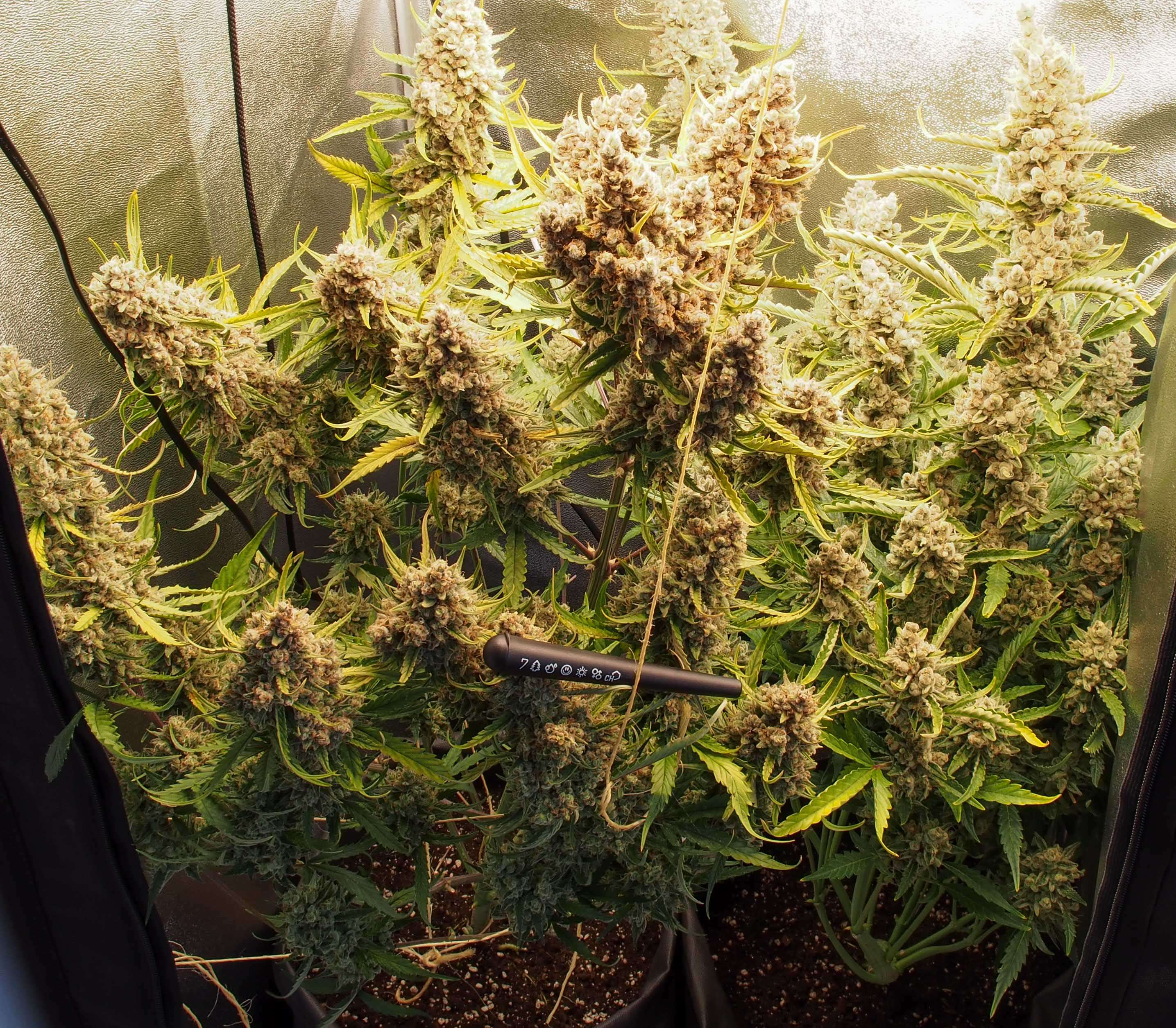 Вторая: Стройная блондинка - полная противоположность сестре. Явно младшенькая. Растёт плотно, стройно, худенькая. Почти не пьёт. Шишки плотные прям, индичного типа. Благоухает меньше сестры, но более изысканно. Очень спортивная - не реагирует на перекормы и дефициты, всегда зелёненькая и в форме.