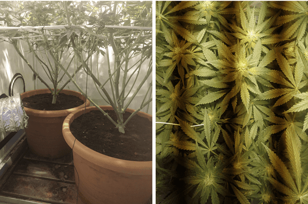 На пятой неделе произошел настоящий БУМ роста кустов. Они начали стремительно заполнять сетку. Гровер перешел на удобрения Green Lab 2,5 мл/л и Big Bud 2 мл/л. На шестой неделе была проведена полная дефолиация нижней части куста, находящегося под сеткой. Это не особо остановило развитие кустов, и уже вначале седьмой неделе они покрыли собой всю сетку скрог. На макушках уже полностью сформировались соцветия. Это был настоящий зеленый ковер на высоте в 90 см от поверхности грунта. Началась активная фаза цветения, а потому гровер опустил уровень влажности до 40%. Появился слабый аромат.