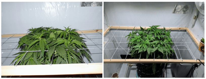 Конопля довольно быстро оправилась от топпинга, начав отращивать нижележащие от среза побеги. Куст продолжил активно набирать зеленую массу. Гровер решил ввести подкормку, начав давать растению по ½ порции удобрений CalMag и Ecogan Perfect NKP. Он также установил сетку скрог над кустом и уменьшил расстояние до лампы до 40 см. В конце четвертой недели рост куста был уже 13 см. Его первые ветви лишь начали прорастать через сетку ScrOG.