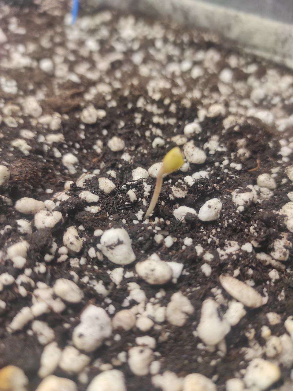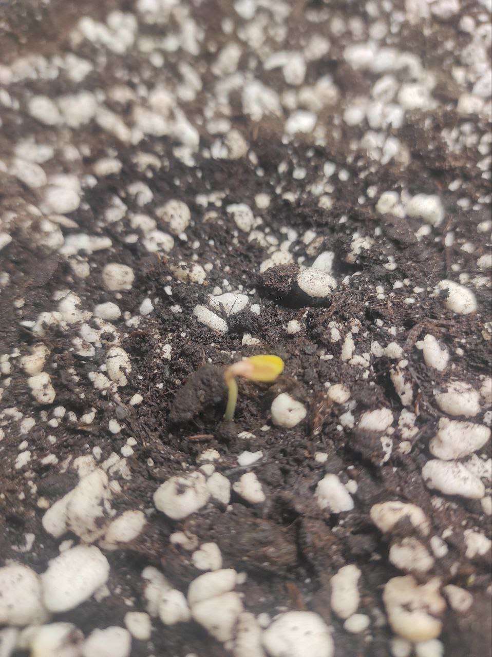Всех приветствую! Прошло двое суток после посадки — и ростки благополучно показались на свет. Пока они бледноватые, но, насколько понимаю, это нормально. Процесс фотосинтеза еще не запустился. Включил им освещение на половину мощности — примерно 100 ватт, лампа висит на высоте 30–35 см. Полива пока не даю, только дважды в день аккуратно смачиваю землю из пульверизатора.
