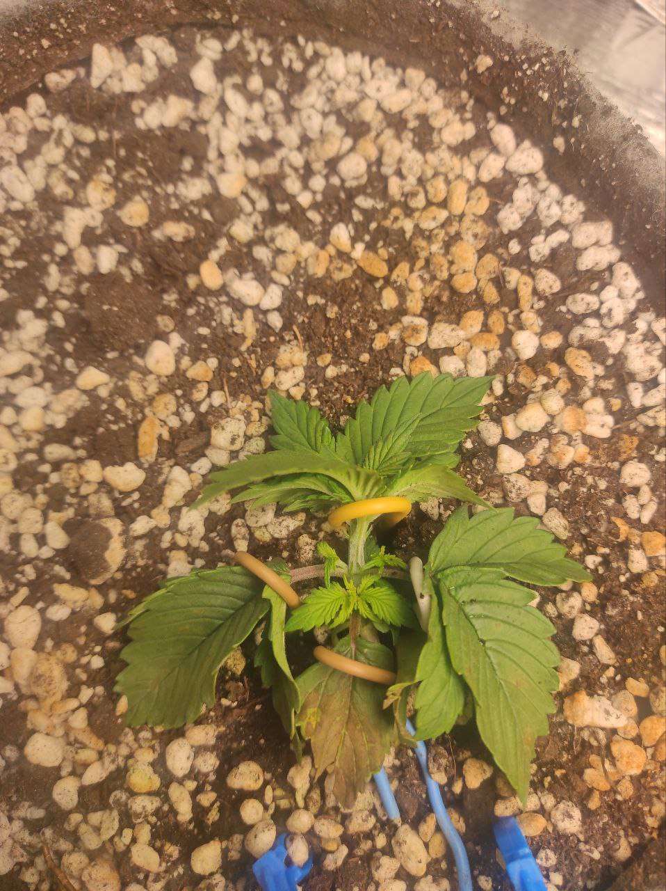 На 7-й день от каски начал лёгкие тренировки. Сейчас Tangie уже растёт параллельно земле, а CBD слегка наклонил. Кто-то может сказать, что для тренировок ещё рано, но я и в прошлом грове начинал так же. Чем раньше — тем лучше, планирую растянуть стебель на всю длину горшка.