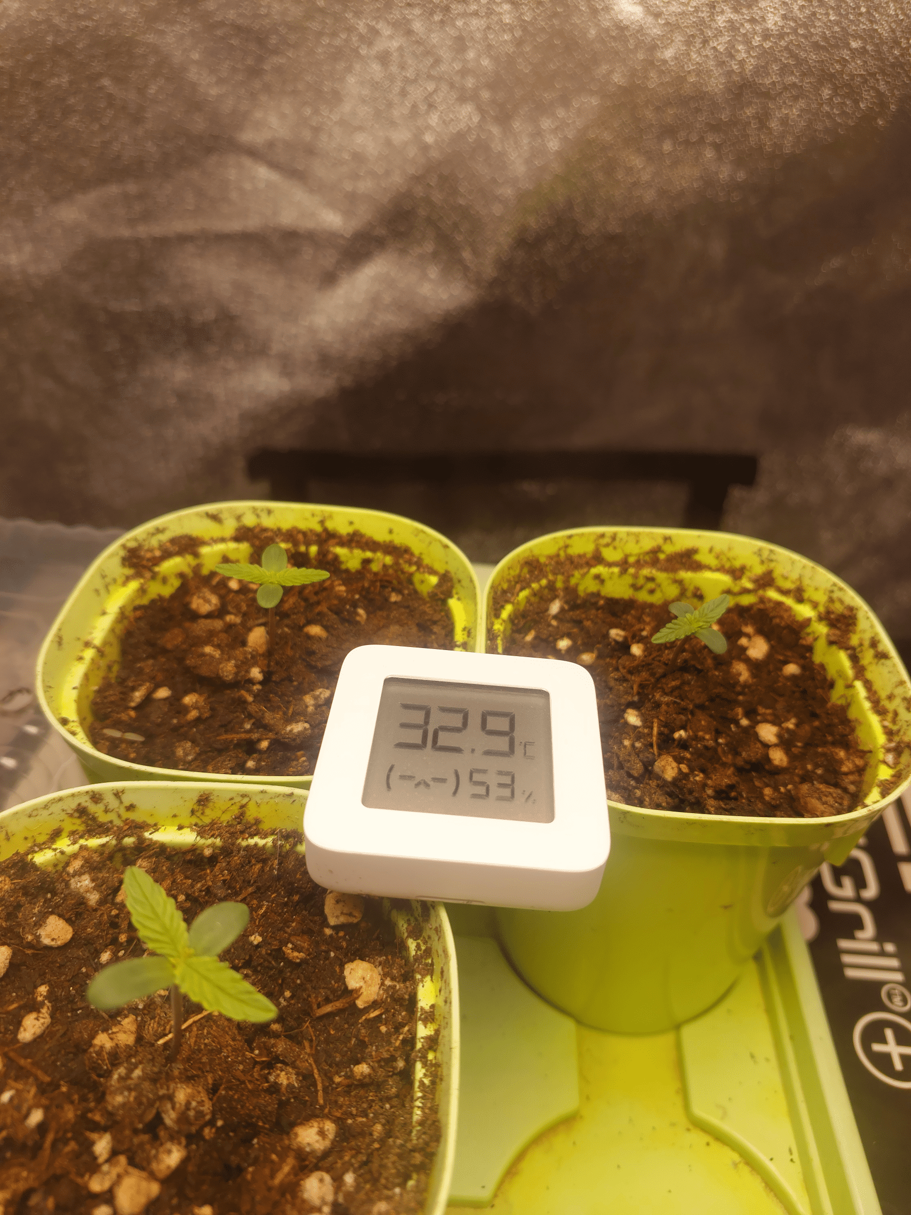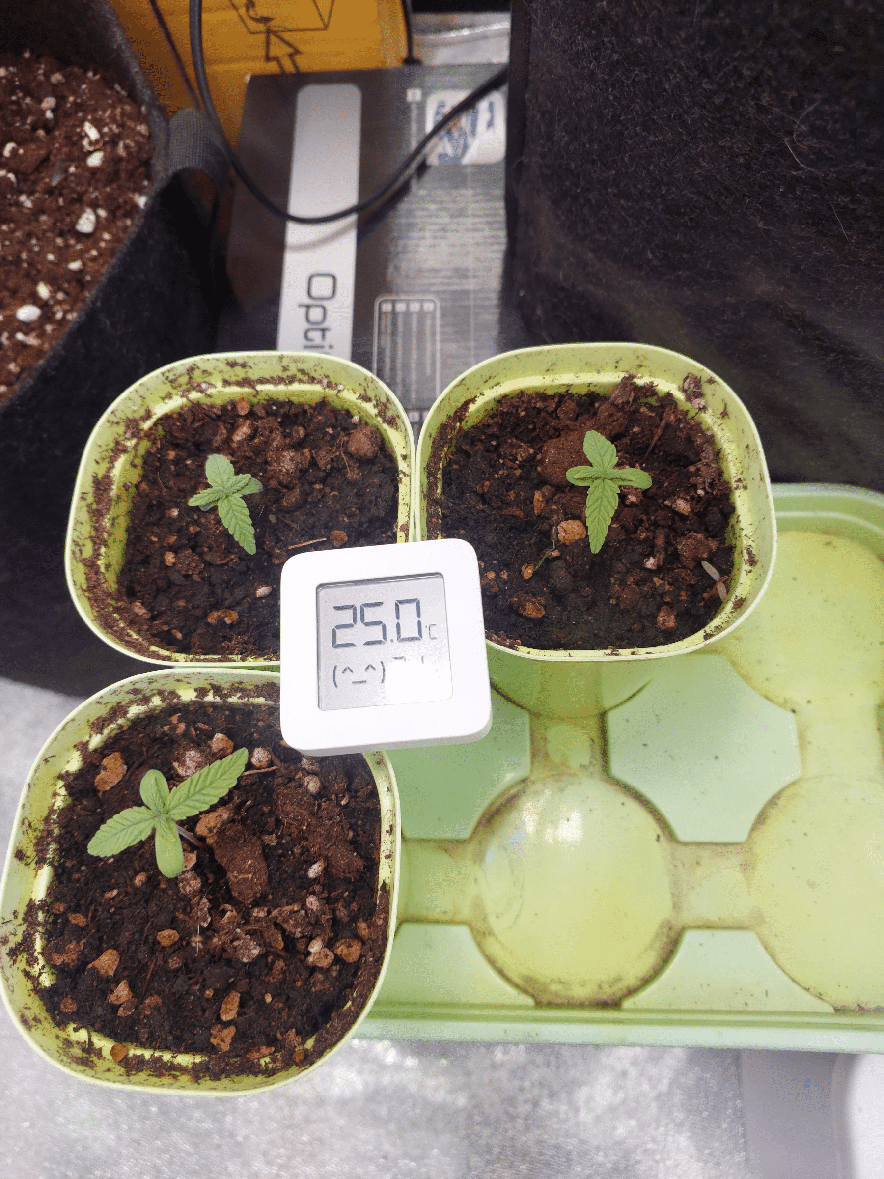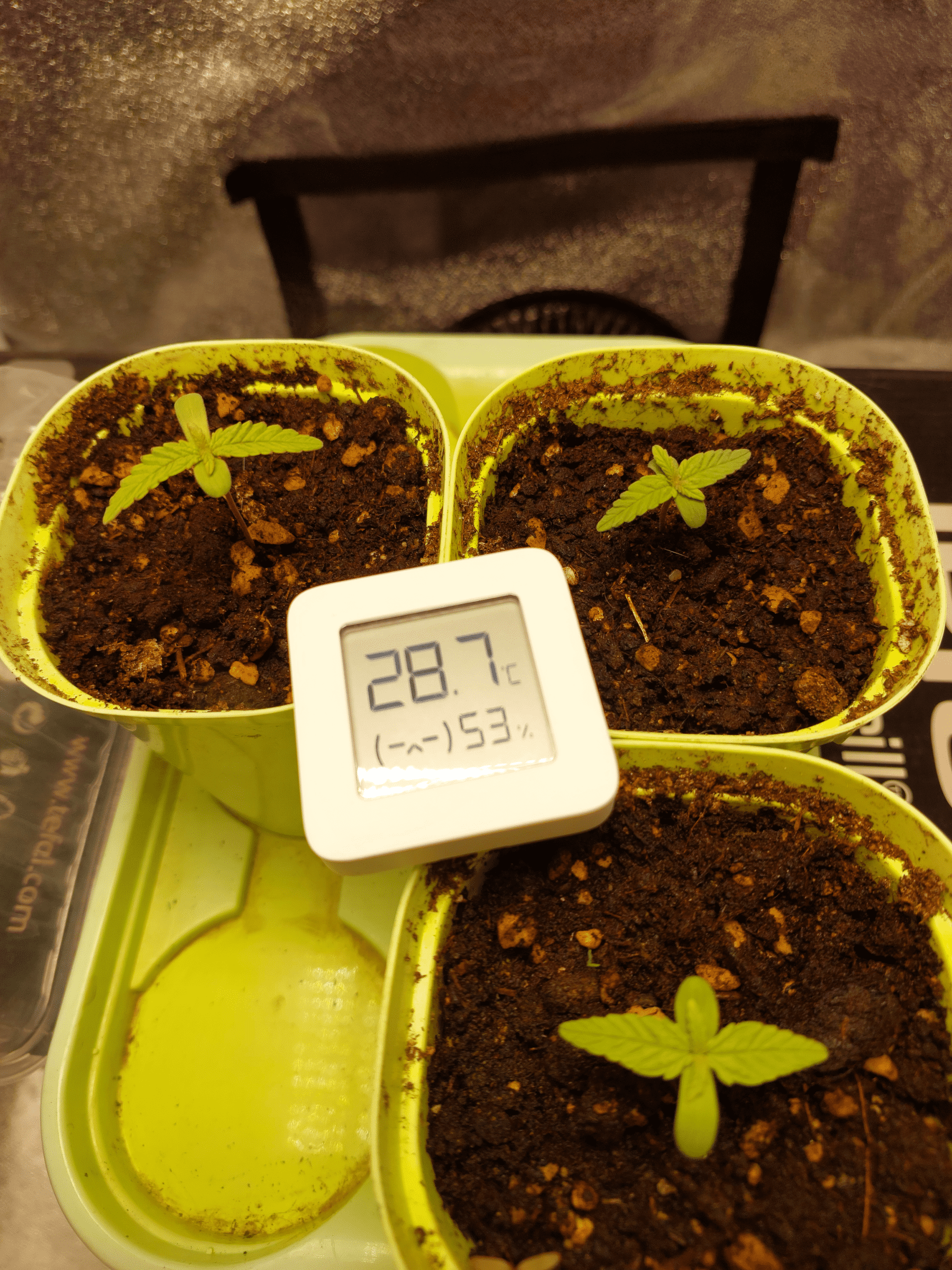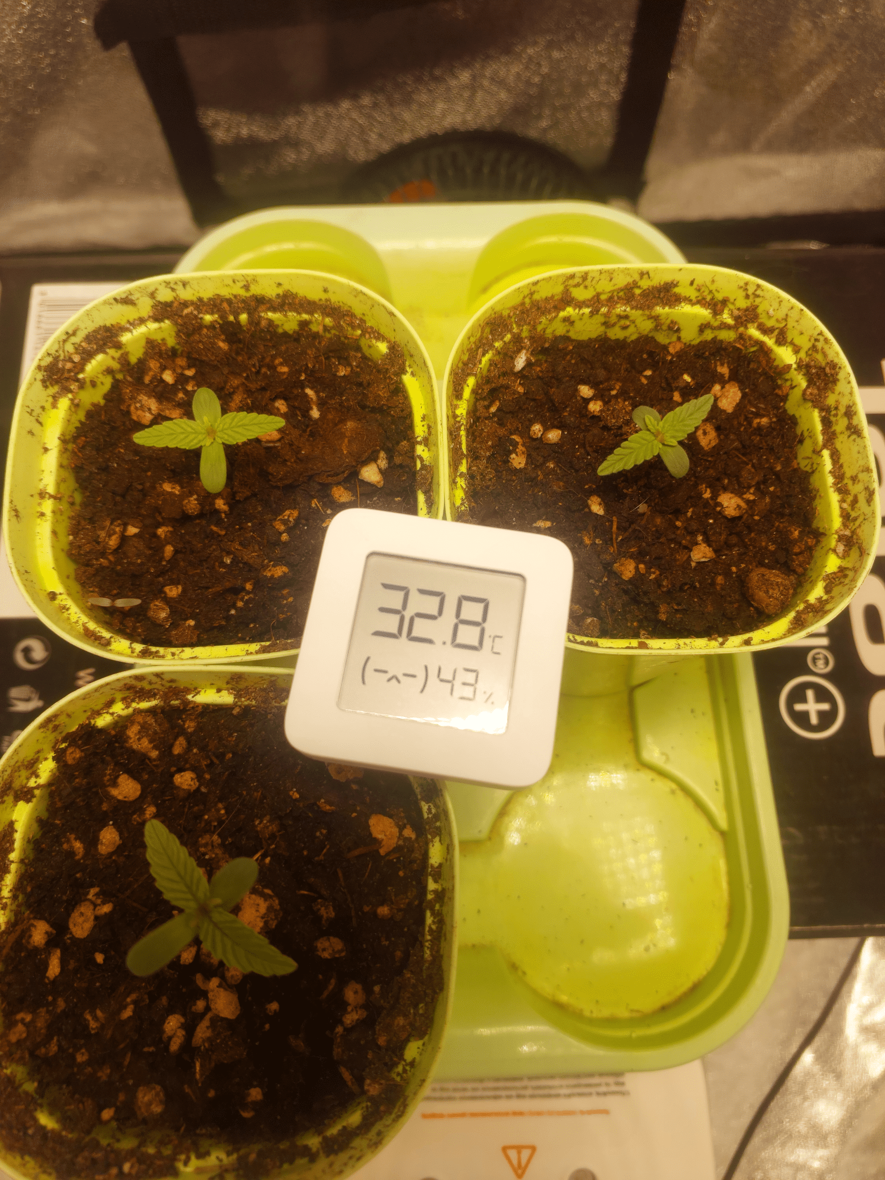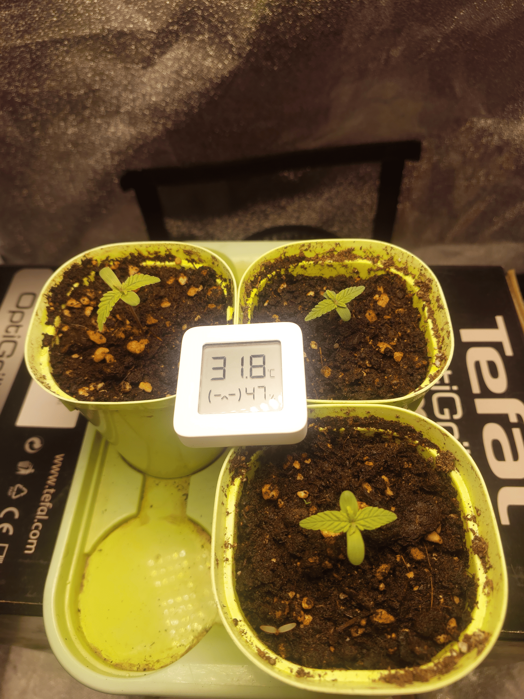 Растишки на первых днях своей жизни столкнулись с экстремальными условиями - температура выше 30, влажность скачет + еще я, кажется опустил слишком низко лампу и они немного подгорели. Лампу поднял до 100 см. Они держатся молодцами:strong. 10 числа полил их из шприца с органикой для формирования корней, остальные поливы водой по мере необходимости.