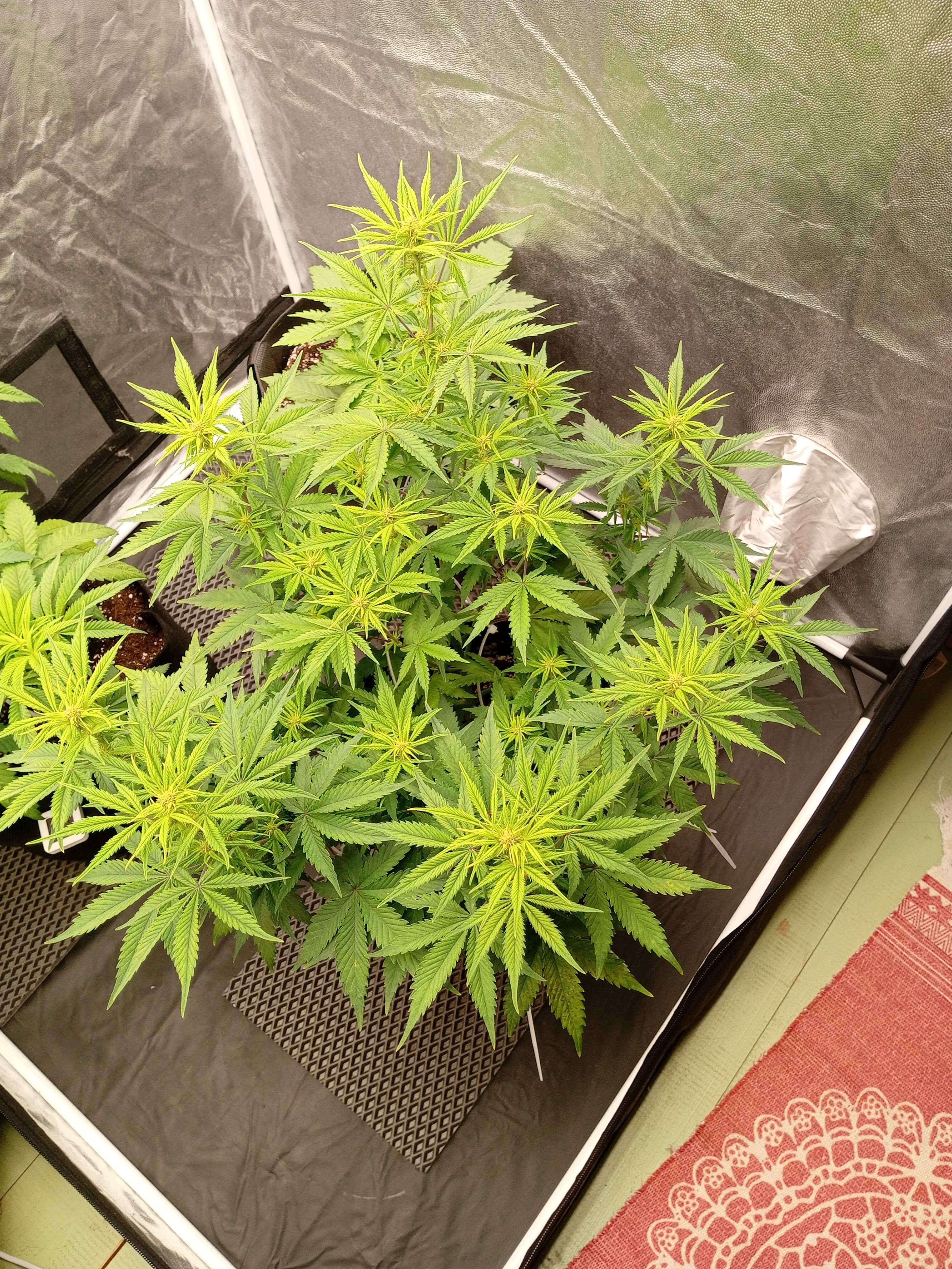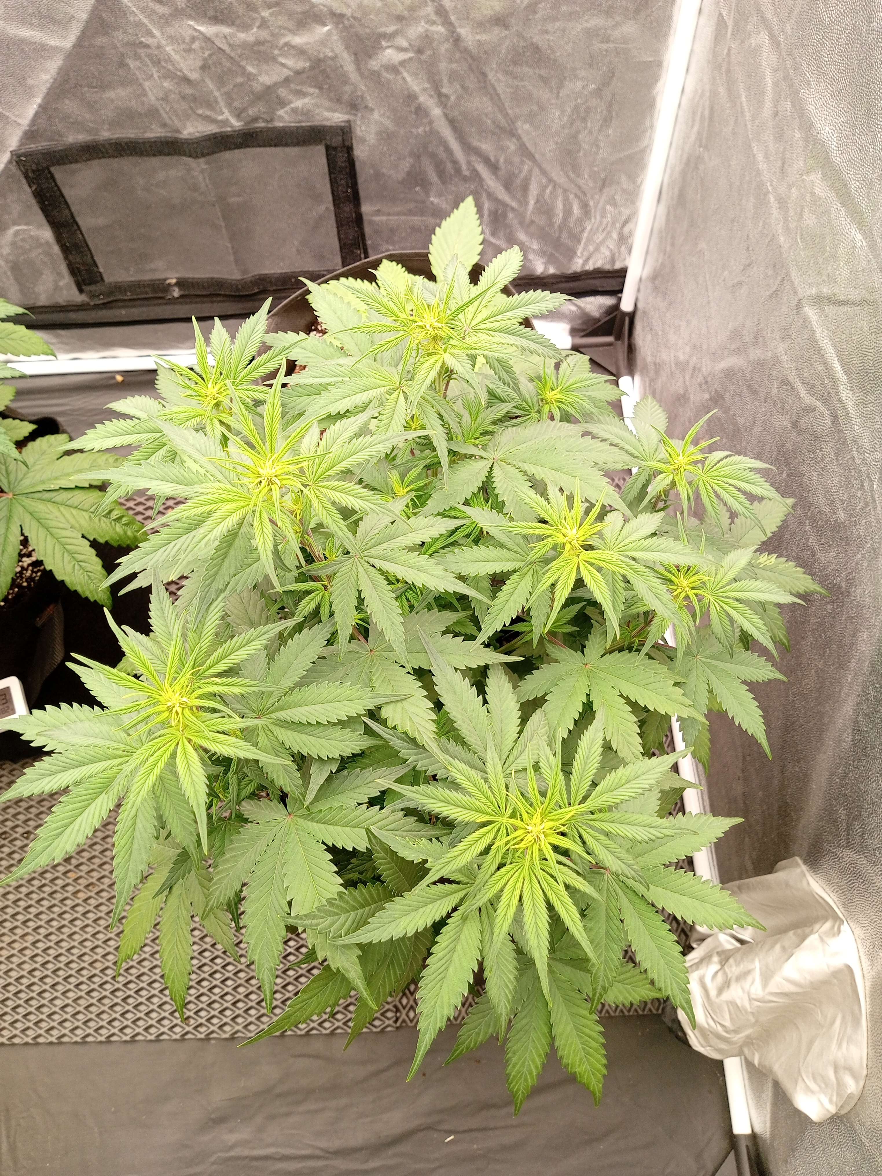 Утром осматривал куст. Нашел неприятные моменты - темные пятна на нескольких листьях. Полагаю, дефицит полезных веществ. Может, азот, может, калий... Неудивительно. Фото в комментариях. А так конец 6 недели