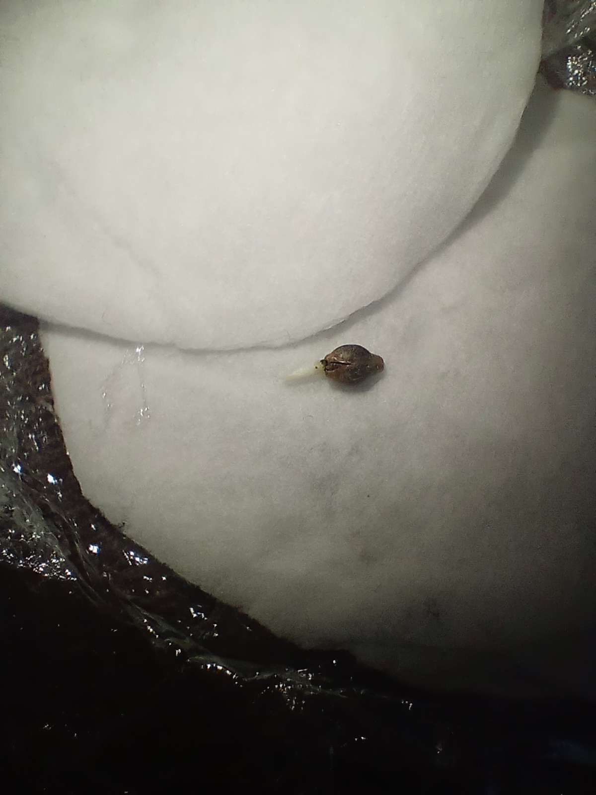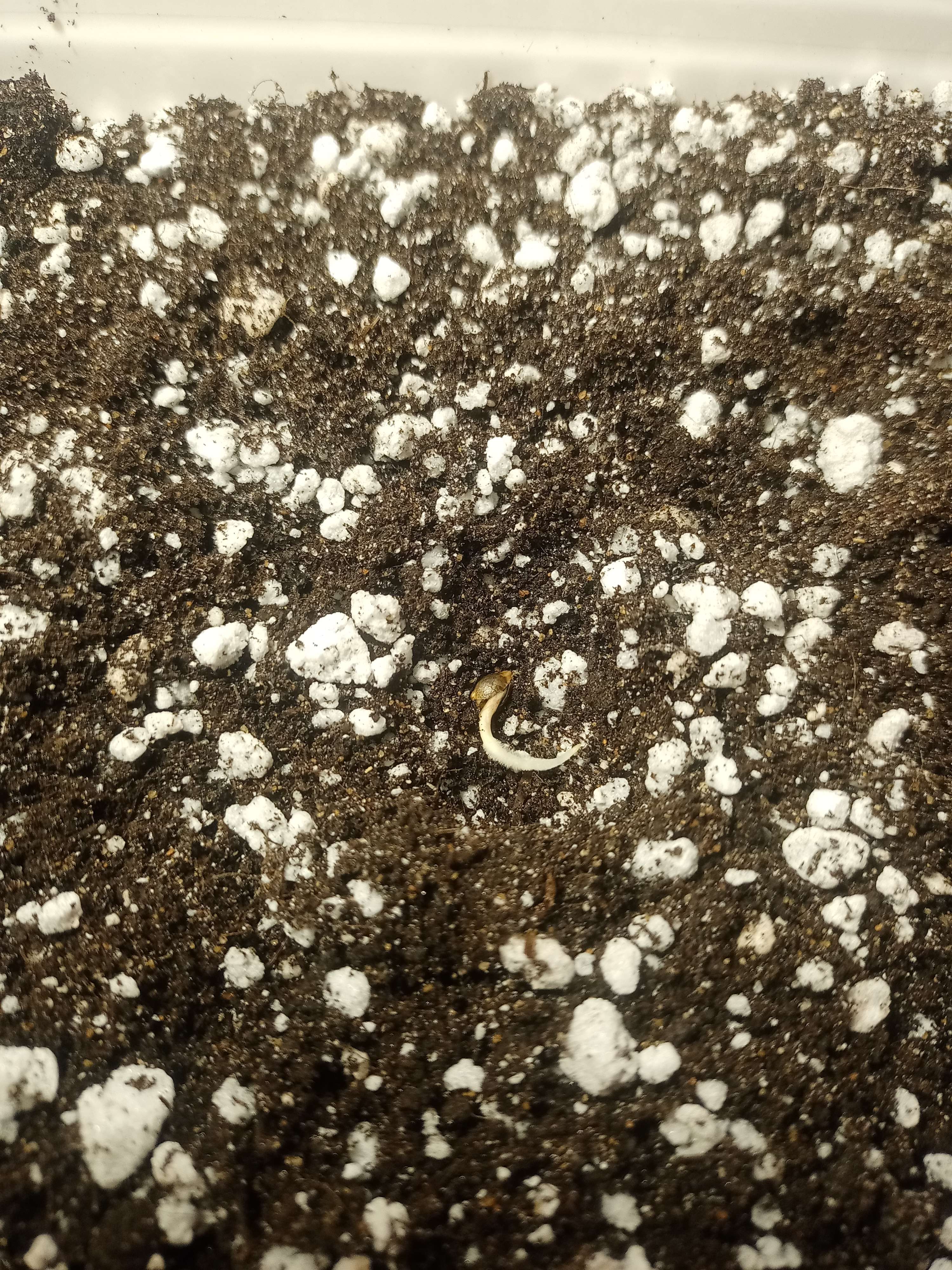Как только пришла семка, сразу кинул ее в раствор перекиси (50мл воды 10 капель перекиси) через сутки семя не треснуло, пришлось применить грубую силу,Чего вам Не советую. Положил семя ещё двое суток меж ватных дисков, и утром 24 числа посадил в землю, Грунт универсальный, Агроперлит 50/50