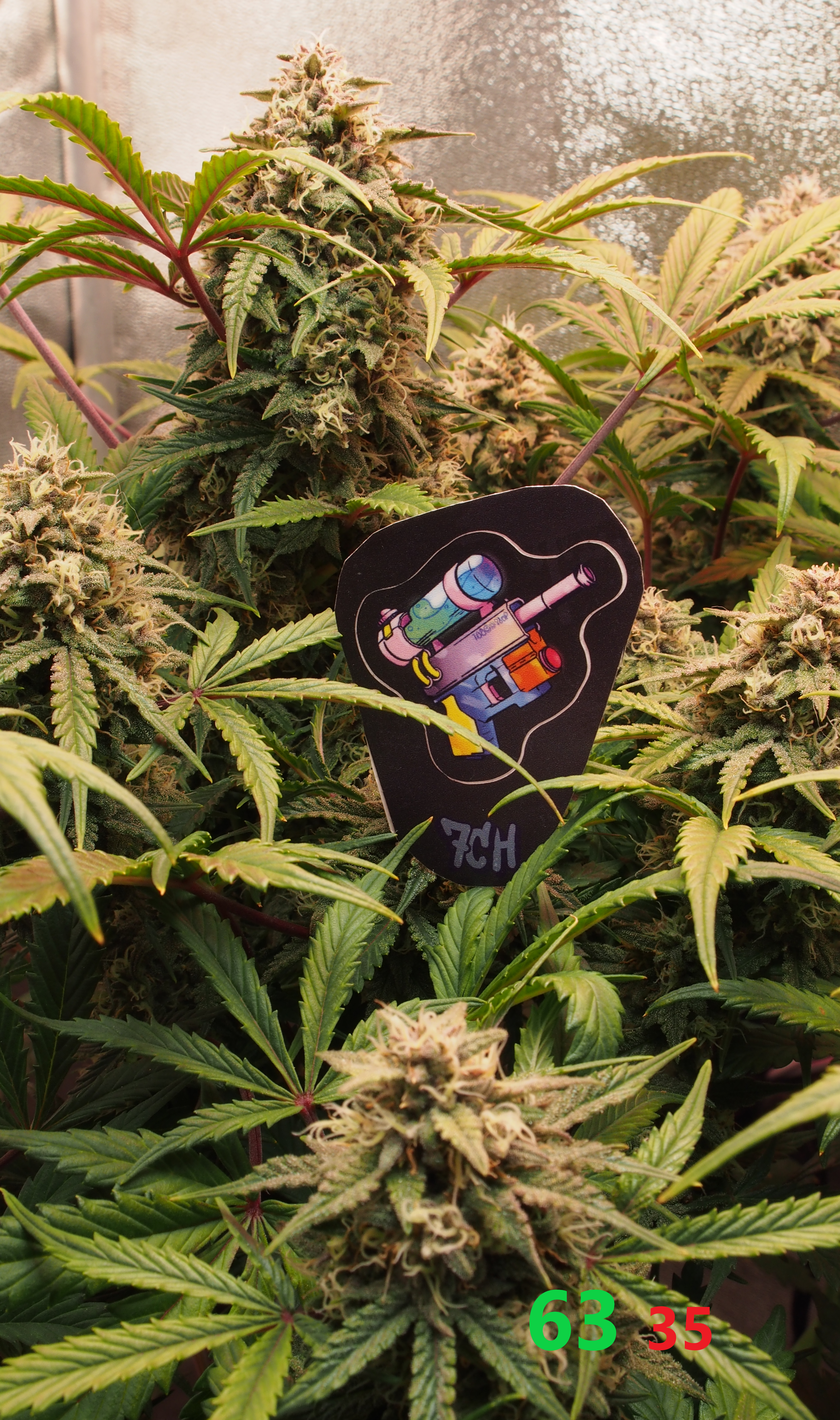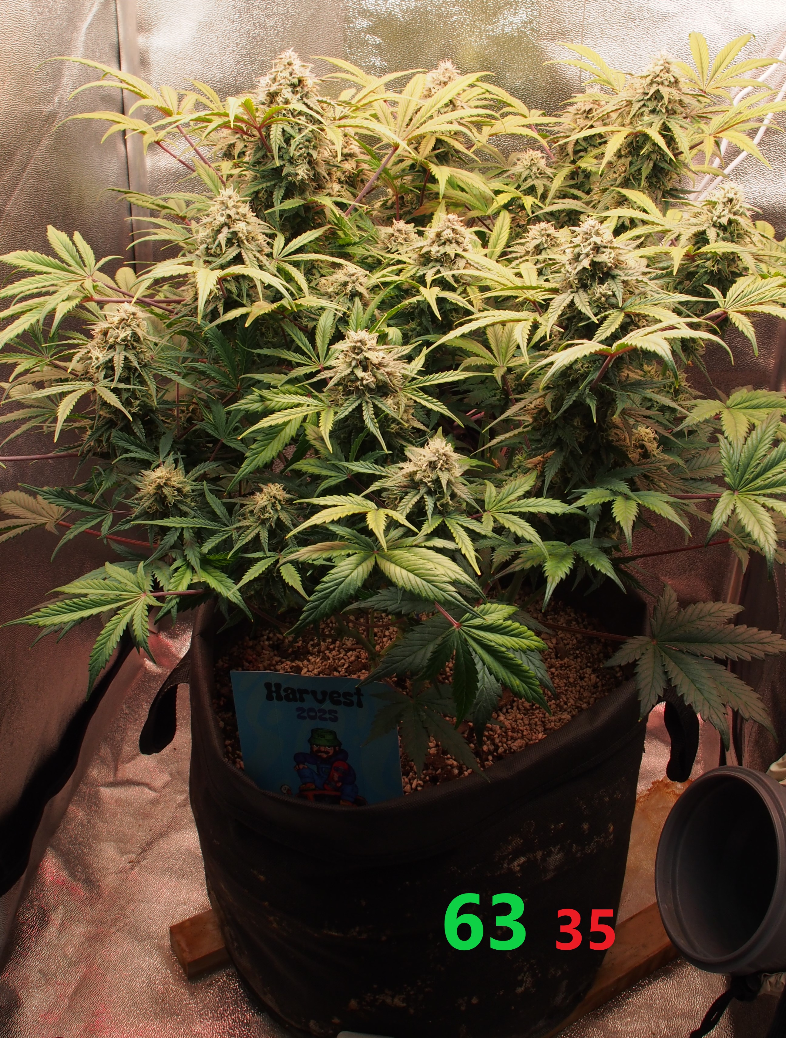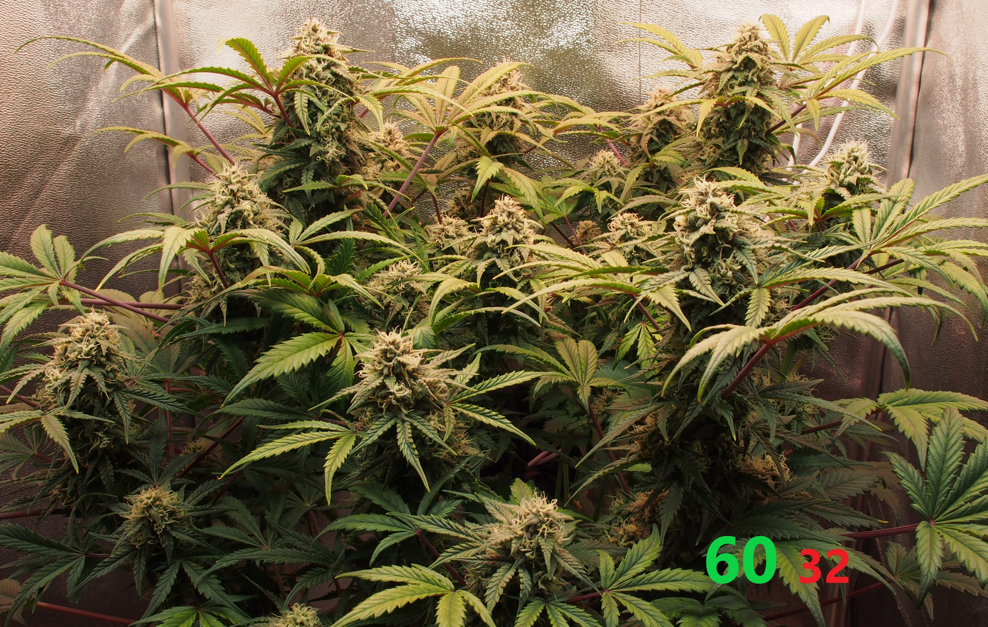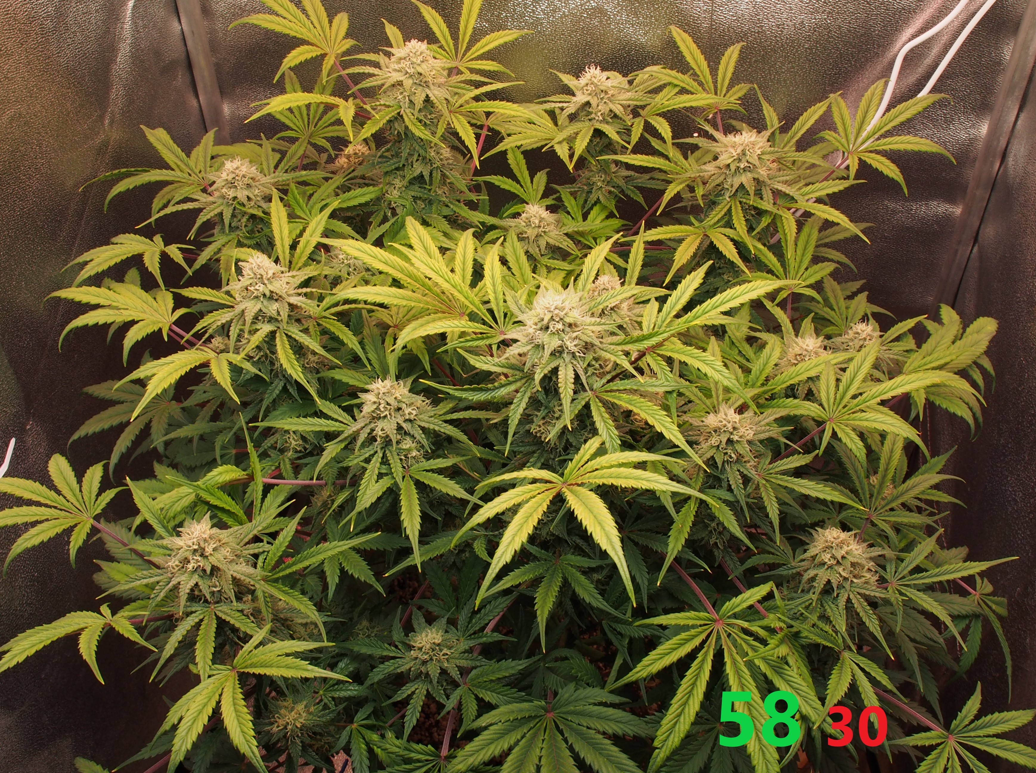 Всем, Джа! Итак, 9 неделя и 5-я неделя цвета позади. Всё идёт по плану, хотя и время "расчётного харва" от сидбанка давно минуло, мы продолжаем цвести и набирать "жир" на соцветиях. Растишка не показывает каких-либо недовольств и дефицитов и поэтому продолжаем через день поливать 3,5 литрами компота с удобрениями и стимами (PPM раствора 950-1000ед.). Особенностью недели является начало применения стима: Overdrive от A.N. (Ripen я не использую, т.к. он исскуственно финиширует растишку, а мне нужно как минимум 2-3 недели созревания. Рост стеблей и листвы фактически завершился, нарастают исключительно соцветия. Запах усилился, но продолжает оставаться не сильным и фантастически приятным: отсутствуют резкие "конопляные" тона, а присутствует только цитрусово-медово-сладкий запах с явным лимонным оттенком. Выполняю самую высокострессовую для гровера тренировку: ничего не делать и не мешать растишке показать свой потенциал. (Планирую тотальную дефолиацию.. но попозже). Свет около 70.000 lux. + красный бустер на 660nm красного света для стимуляции роста соцветий.