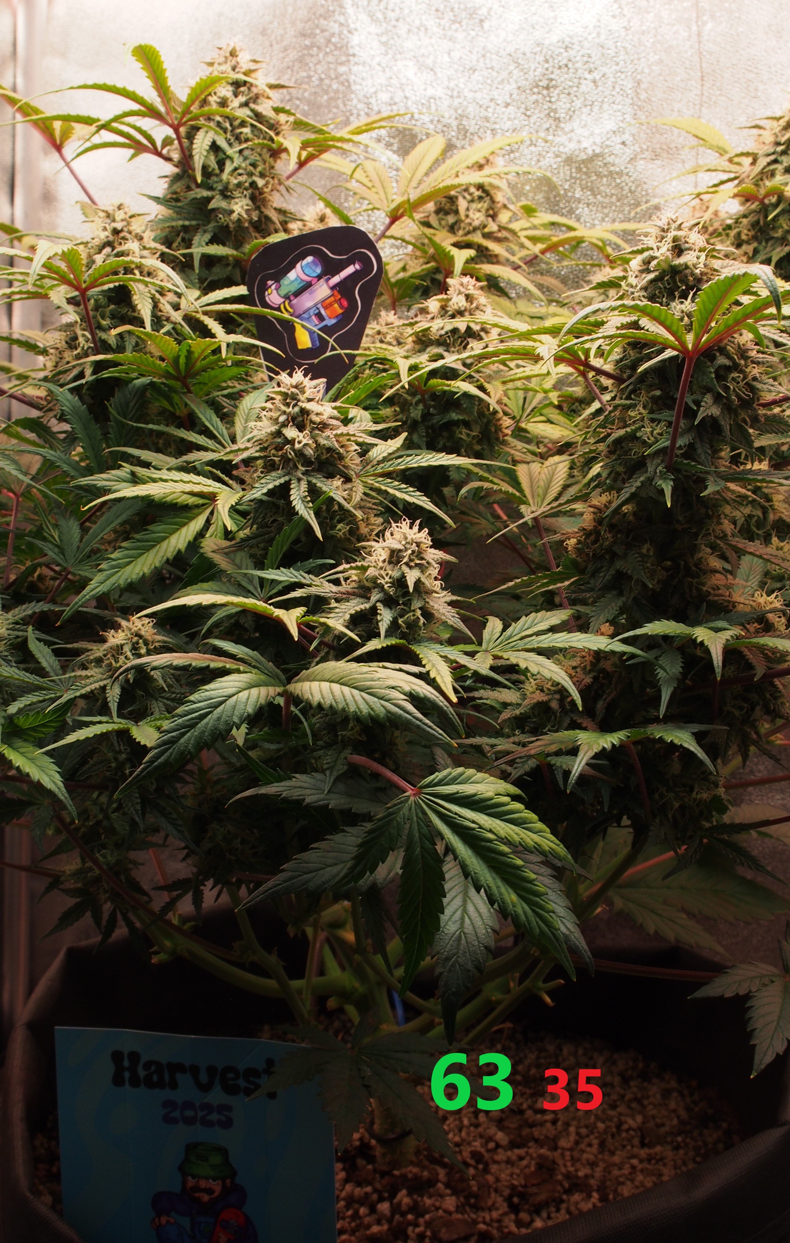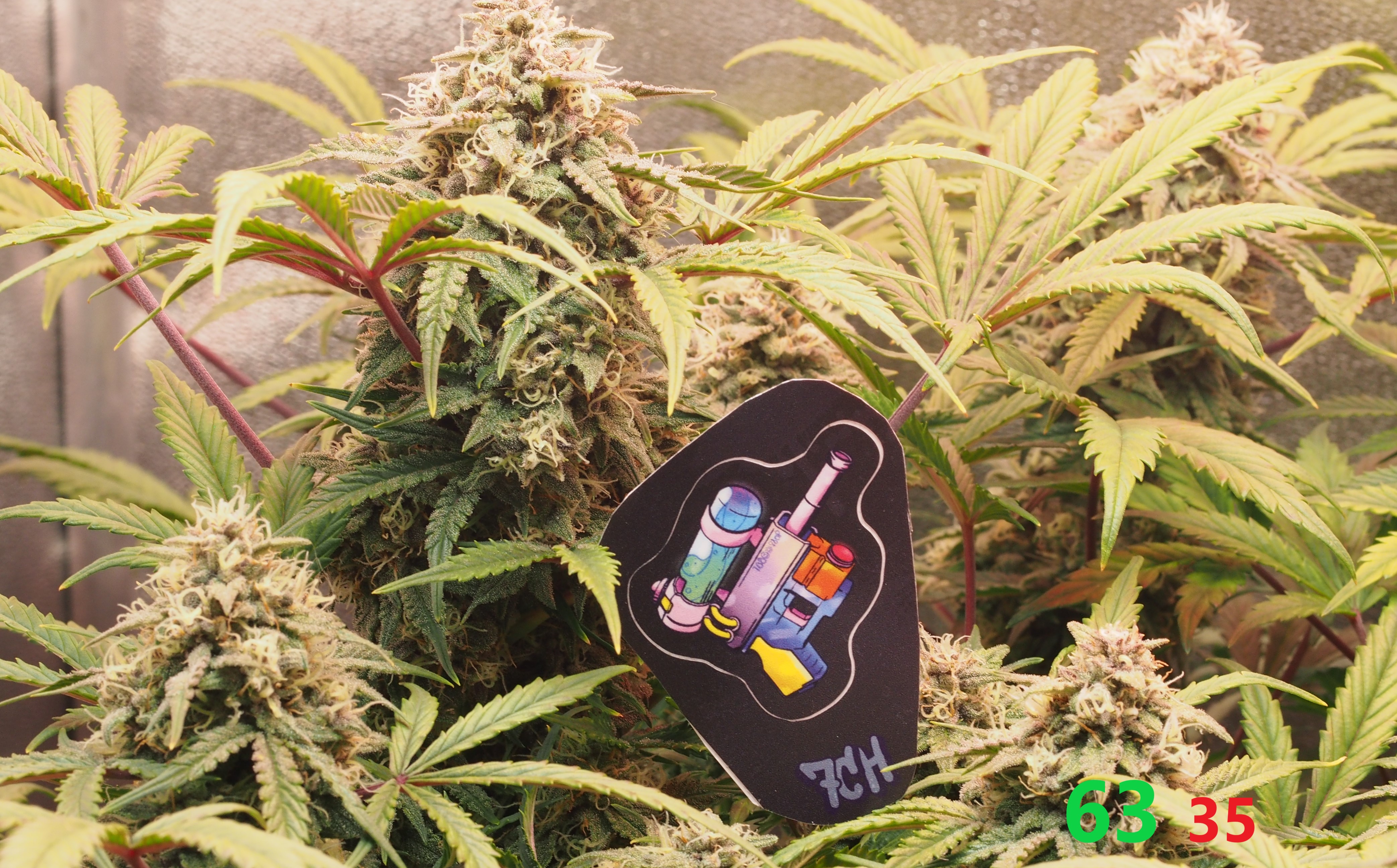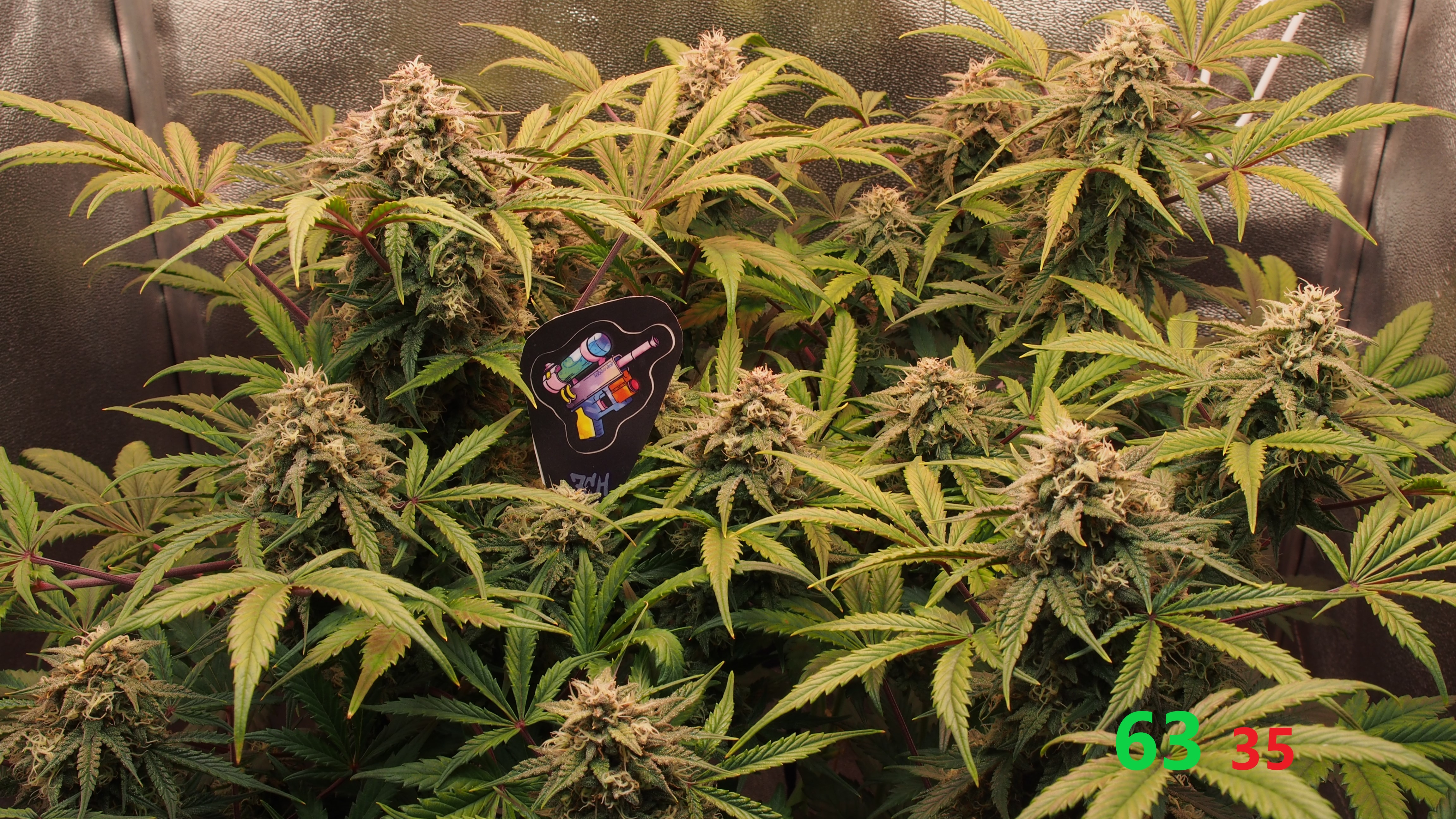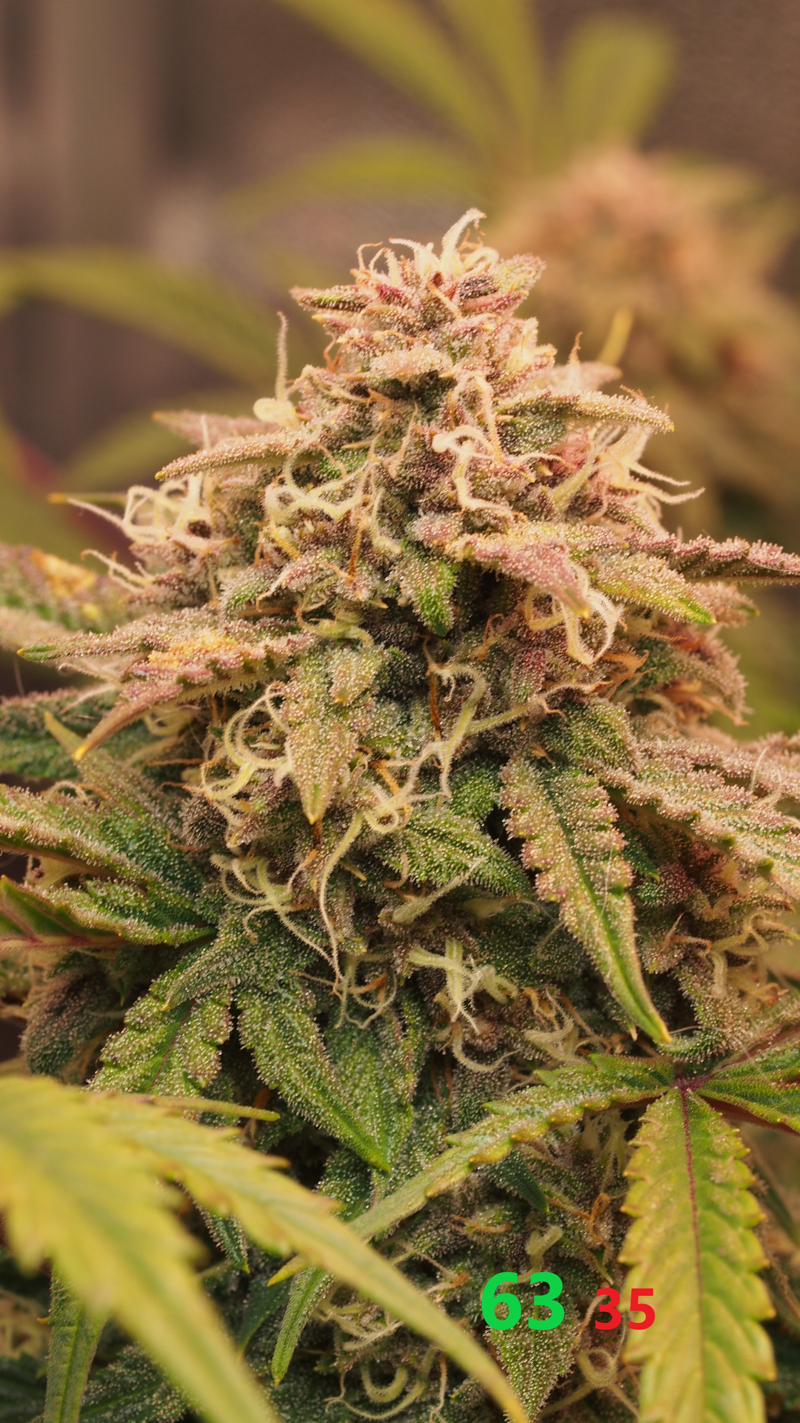Всем, Джа! Итак, 9 неделя и 5-я неделя цвета позади. Всё идёт по плану, хотя и время "расчётного харва" от сидбанка давно минуло, мы продолжаем цвести и набирать "жир" на соцветиях. Растишка не показывает каких-либо недовольств и дефицитов и поэтому продолжаем через день поливать 3,5 литрами компота с удобрениями и стимами (PPM раствора 950-1000ед.). Особенностью недели является начало применения стима: Overdrive от A.N. (Ripen я не использую, т.к. он исскуственно финиширует растишку, а мне нужно как минимум 2-3 недели созревания. Рост стеблей и листвы фактически завершился, нарастают исключительно соцветия. Запах усилился, но продолжает оставаться не сильным и фантастически приятным: отсутствуют резкие "конопляные" тона, а присутствует только цитрусово-медово-сладкий запах с явным лимонным оттенком. Выполняю самую высокострессовую для гровера тренировку: ничего не делать и не мешать растишке показать свой потенциал. (Планирую тотальную дефолиацию.. но попозже). Свет около 70.000 lux. + красный бустер на 660nm красного света для стимуляции роста соцветий.