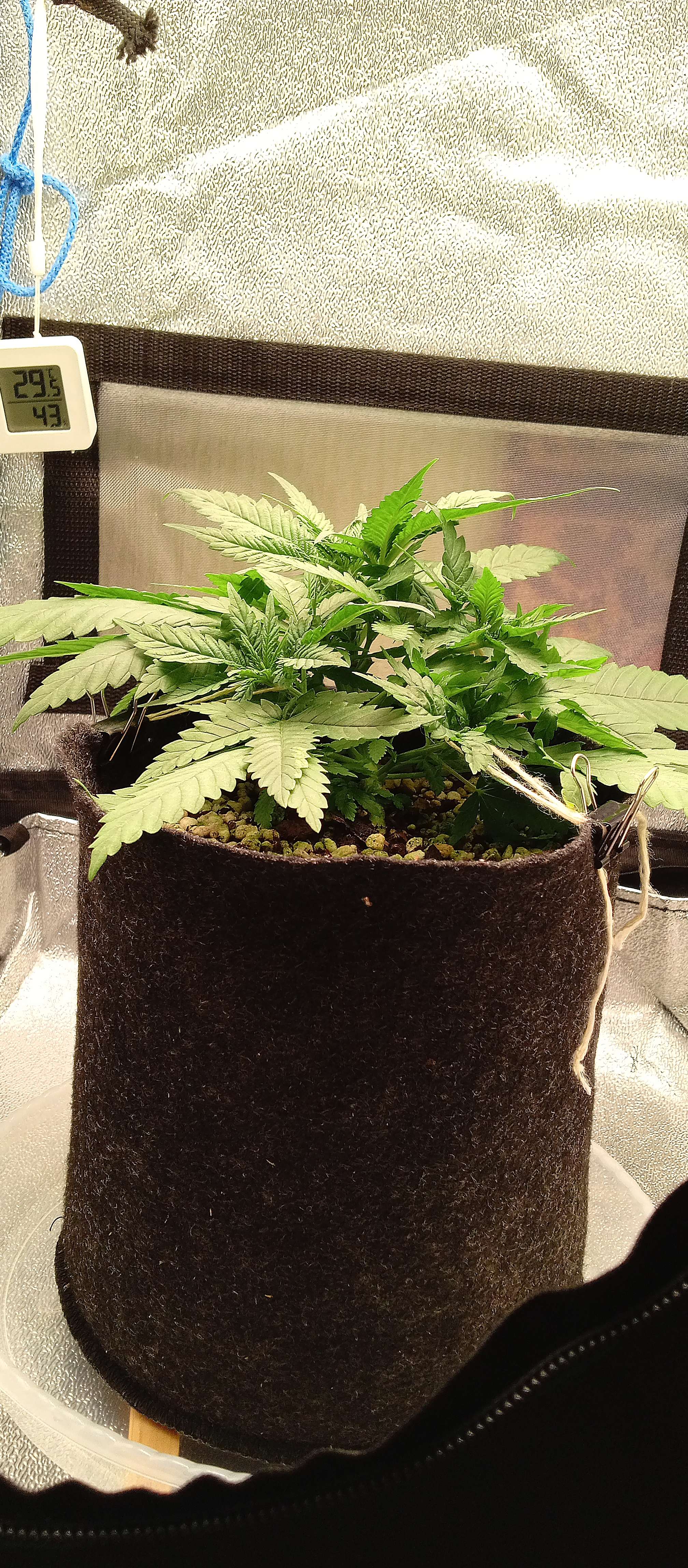 15.08. Подросла и всё больше распушилась. Честно не ожидал, не ожидал. Хер подлезешь, не даёт сделать LST. Отпустил все верёвки, пущяй так растёт. Потом дефолиацию сделаю.