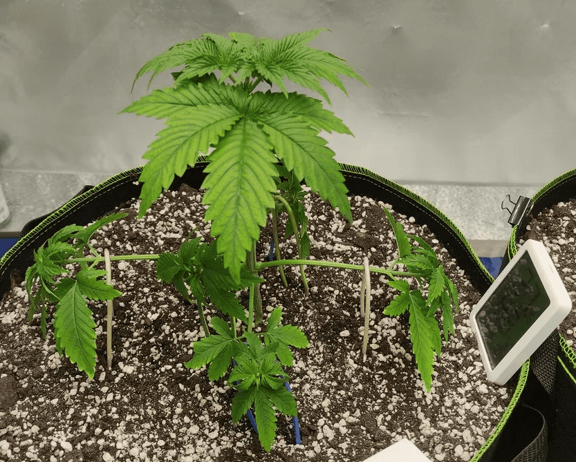 На этой неделе, на 19й день (он на неделю отстает от Брюса), топнул растиху, обрезал лишние (имхо) листья и пригнул боковые колы. Топнул 7й этаж.