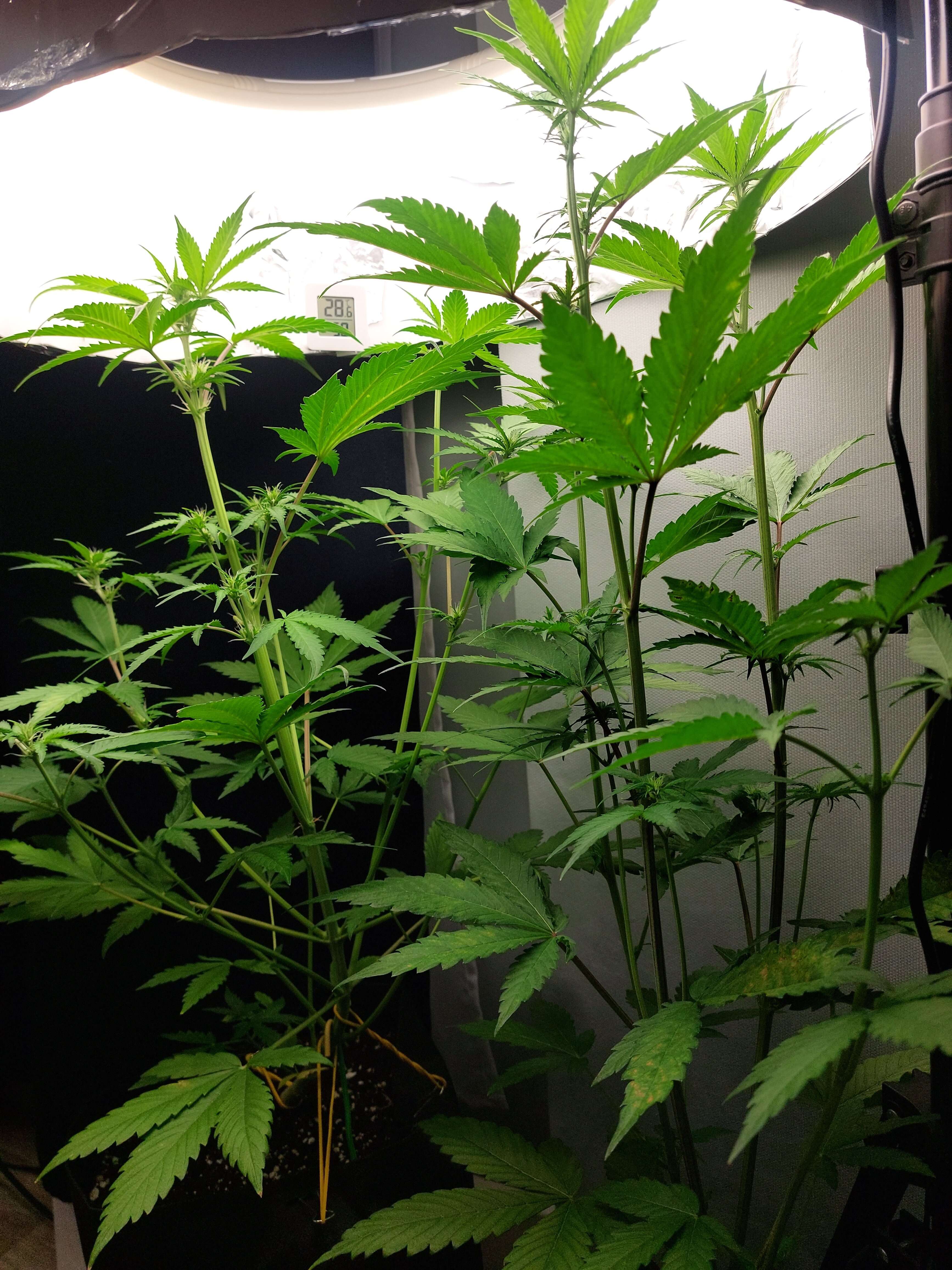 После полива кусты опускают листы. Странно, пш 6,5. 1 литр компота на цвет, через день вода. Есть несколько больных листов от ожога светом, есть немного пожелтевших. Это свет и кривой режим. Убрал местами фольгу с торшера, чтобы листья не горели - помогло. Свет стараюсь давать ближе к 18/6, но бывает что не спят двое суток или наоборот сна 8 часов. Нашёл в записях свет на цветении давать 12/12, но в репортах не увидел - пропускаем. Красные ветви у листов это какой-то знак или норма?