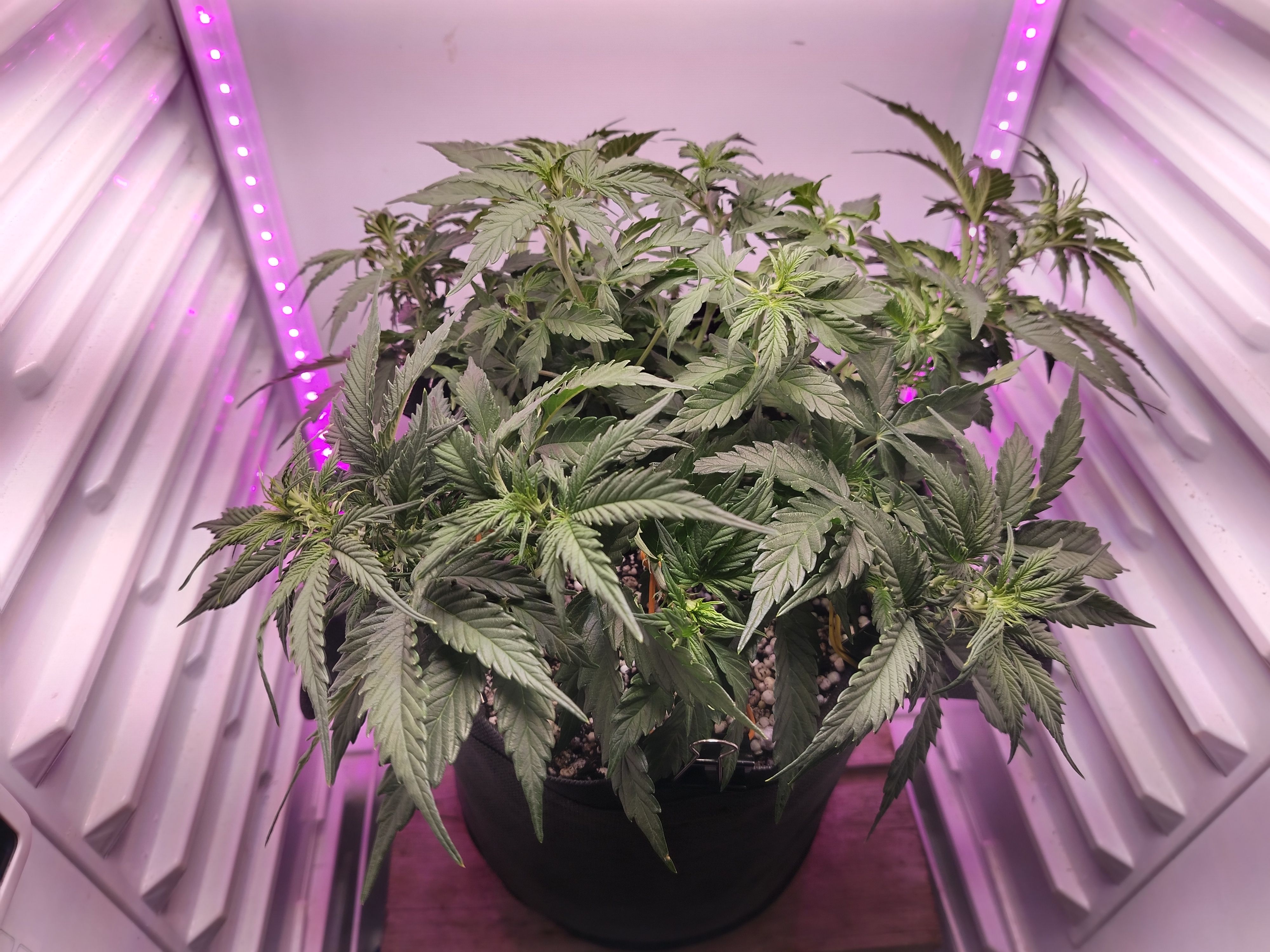 Пошла 6 неделя. Заметно наращиваем массу. Полил сегодня водой: 3 л, 151 ппм, 6.7 пш. Дренаж: 0.6 л, 924 ппм, 6.8 пш. Если я правильно понял, то теперь можно спокойно кормить. Следующий полив будет компотом. Растянул немного веточки, а то прям очень кучно они прут. Соцветия пока не формируются, но усики уже на всех междоузлиях. Клон же медленно, но уверенно растет. Вчера даже угостил меня парой листочков, чтоб на дискотеке скучно не было). В общем едем дальше.