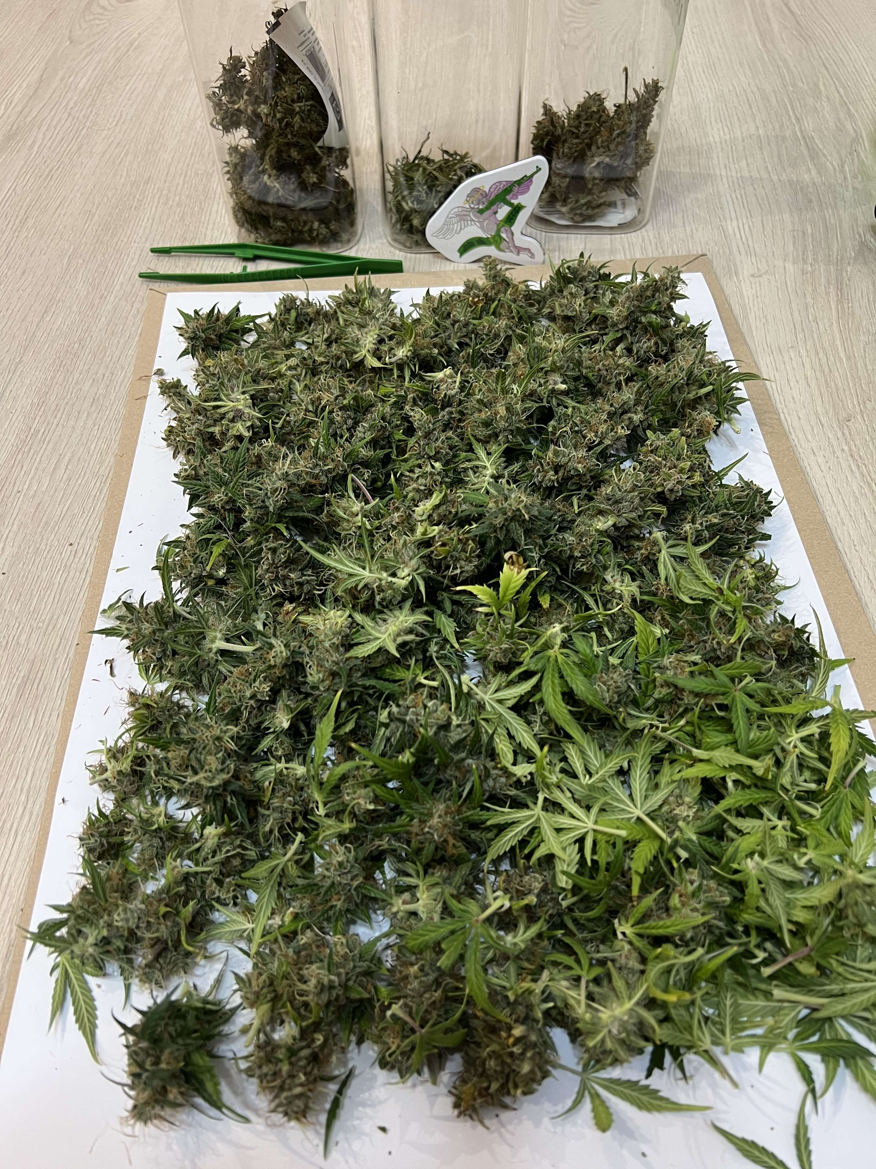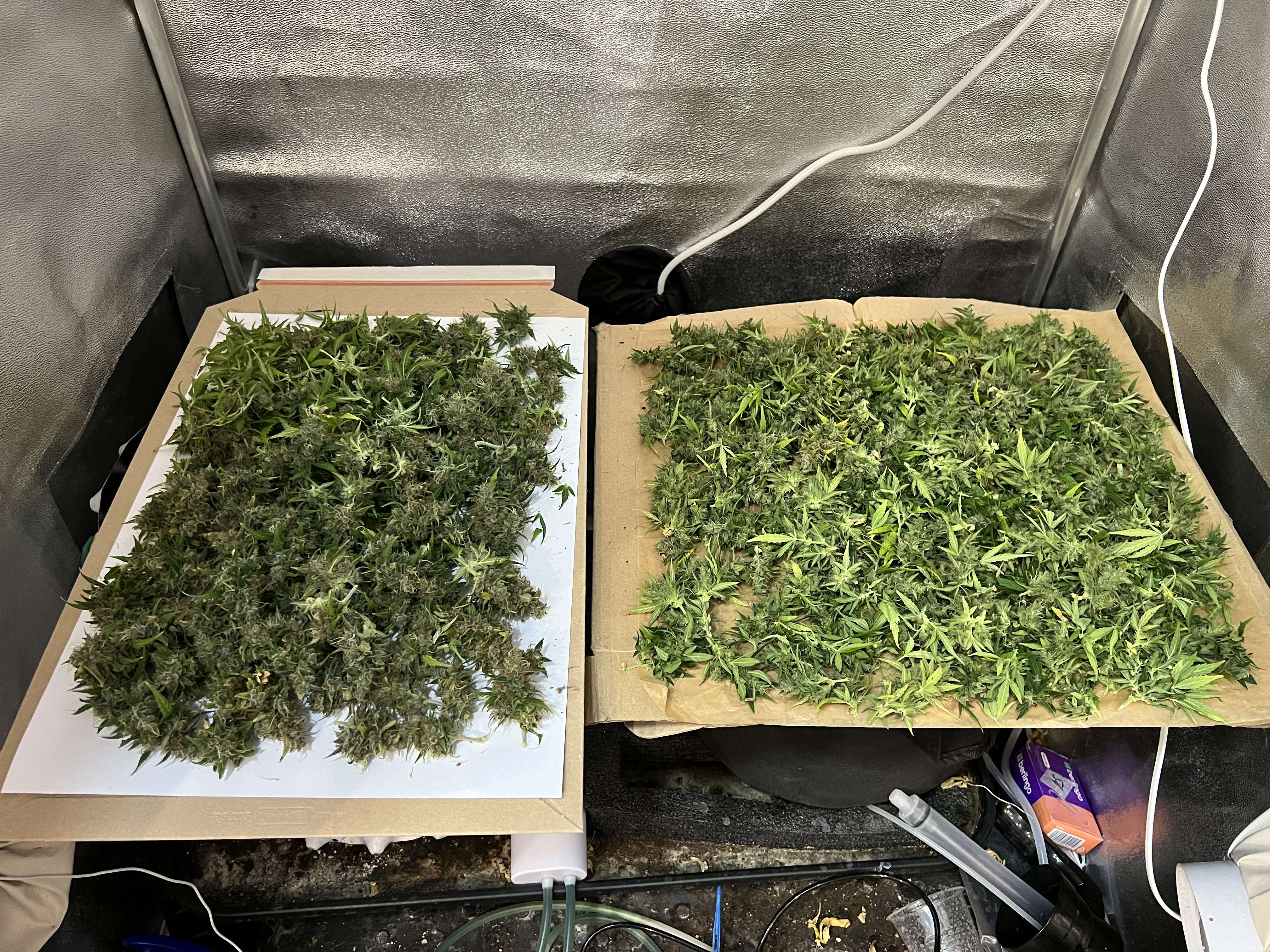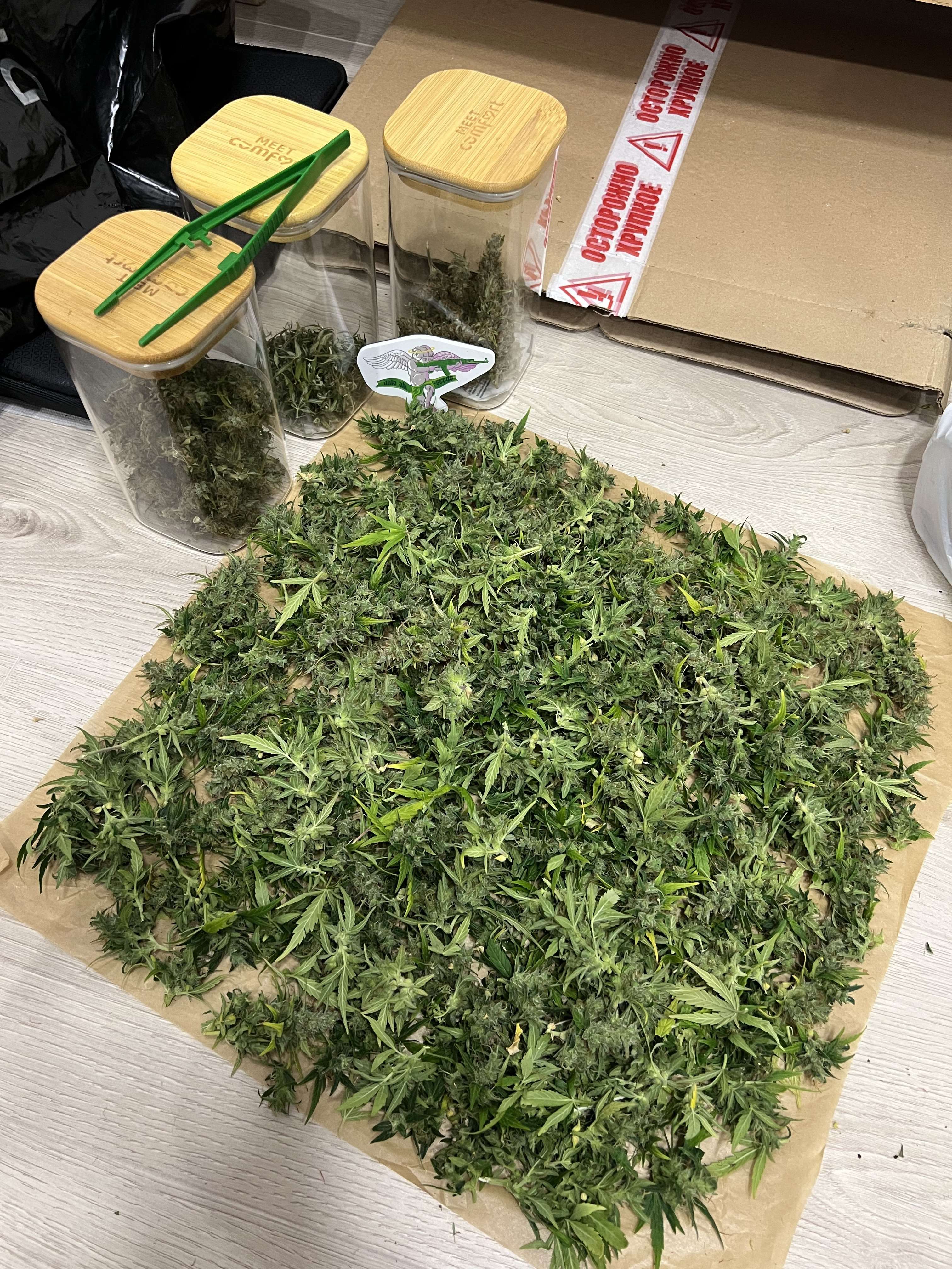 За этим гровом следить почти не получилось. Отсутствовал месяц (сделал заготовки и попросил друга поливать). Девочек почти не трогал. Урожай получился сильно больше предыдущего — на фото мокрый вес Джонни и Лемона. Это ещё и с учетом того, что я их солидно подергал на цвете на покур! Не взвешивал (надеюсь получится найти весы хоть сухой взвесить).