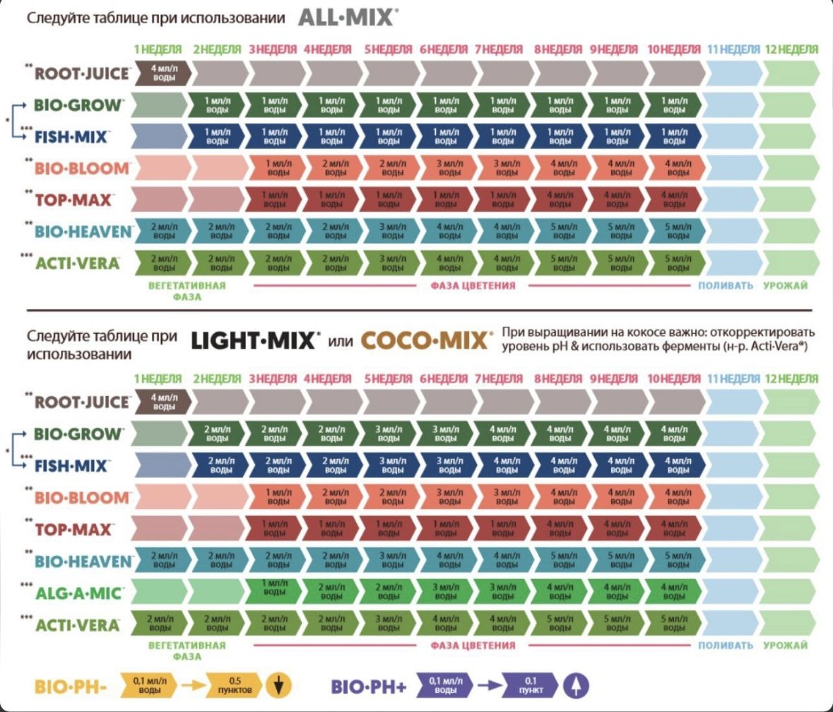 С компотами ничего особо не придумываю. Кормлю четко по бизовской таблице*, за исключением пары моментов: root-juice буду лить до предцвета по 4ml в неделю и bio-grow снизила дозировку до 1ml в неделю. *таблица в приложенных фото